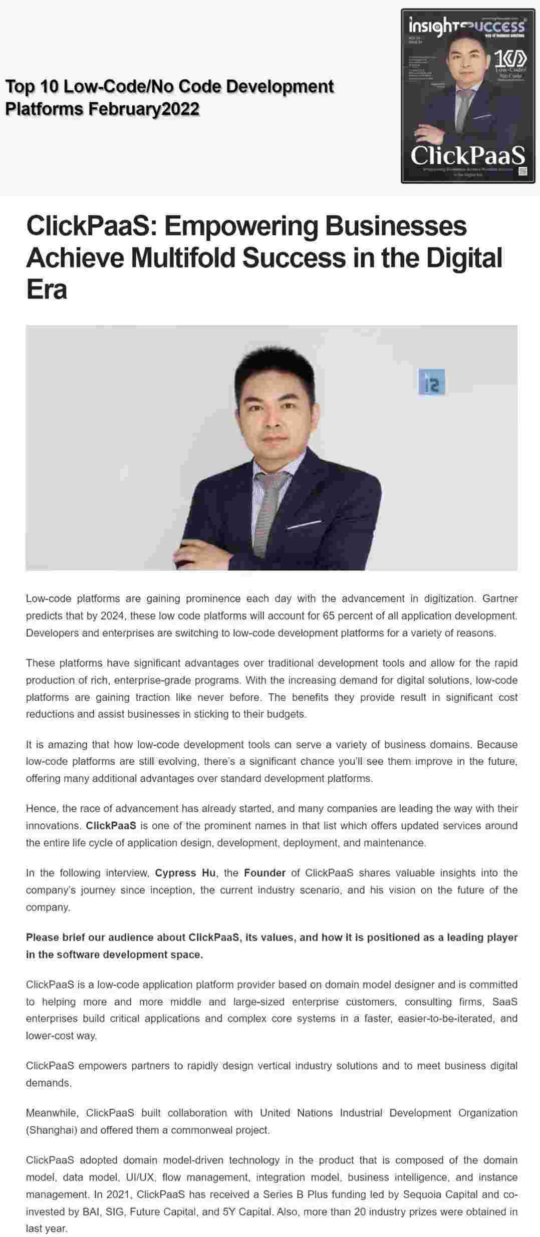 2022年年初,,,,,,,,,NO钱包入选外媒Insights Success低代码/无代码开发平台 Top10,,,,,,创始人、、、、、、、、、CEO胡柏受邀接受专访并荣登封面人物,,,,,,,,,,,,他与Insights Success的读者分享了NO钱包成立的初心、、、、、、、、、、、、发展历程、、、、、、、、当前的行业发展趋势以及他对公司未来的展望。。。。。。。。。。。。。